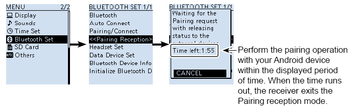 上述設置后在MENU/Bluletoothset/Pairng Reception/進入配對等待屏幕。