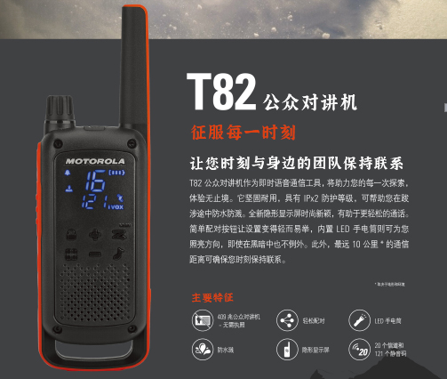 T82 公眾對講機特性:409兆公眾對講機-無需執照,輕松配對組呼功能,LED手電筒,IPx2防水濺等級,隱形顯示屏,20個信道和121個靜音碼。