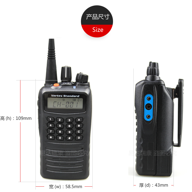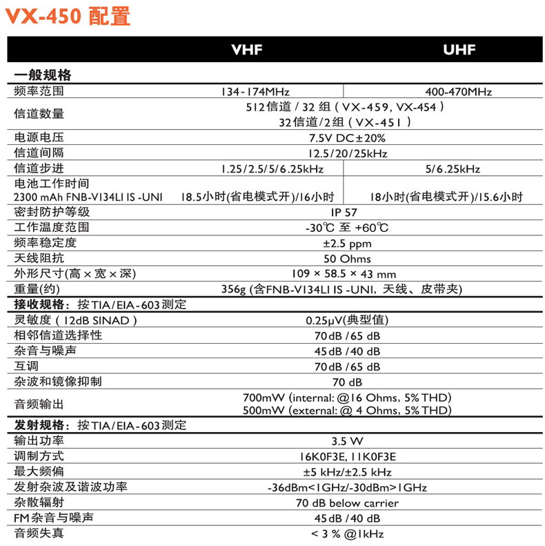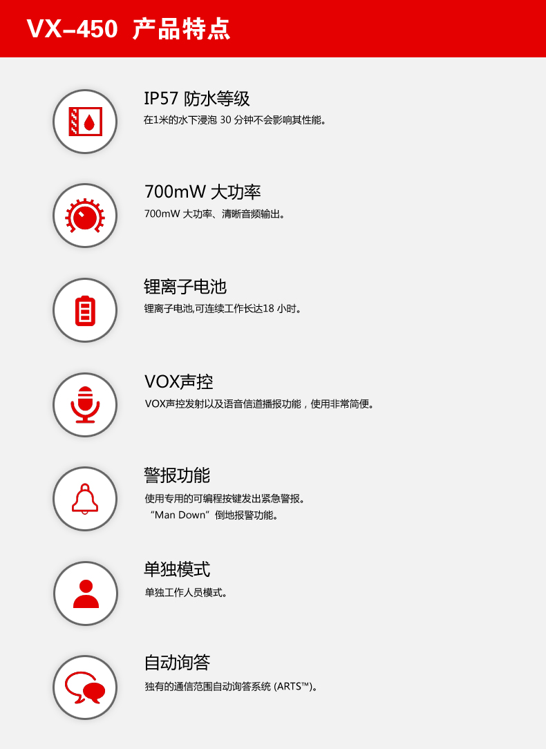 IP57防水等級,在1米的水下浸泡30分鐘不會影響其性能。700mW大功率揚聲器、清晰音頻輸出。VOX聲控發射功能以及語音信道播報功能。