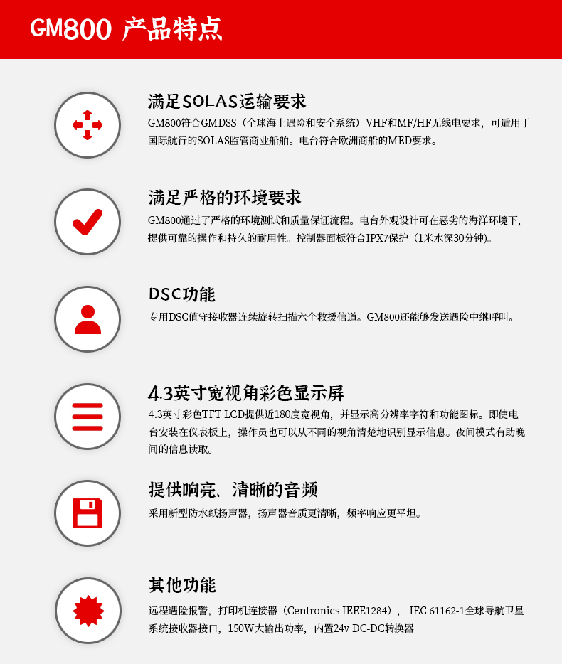 DSC功能 滿足SOLAS運(yùn)輸要求 滿足嚴(yán)格的環(huán)境要求 4.3英寸寬視角彩色顯示屏
